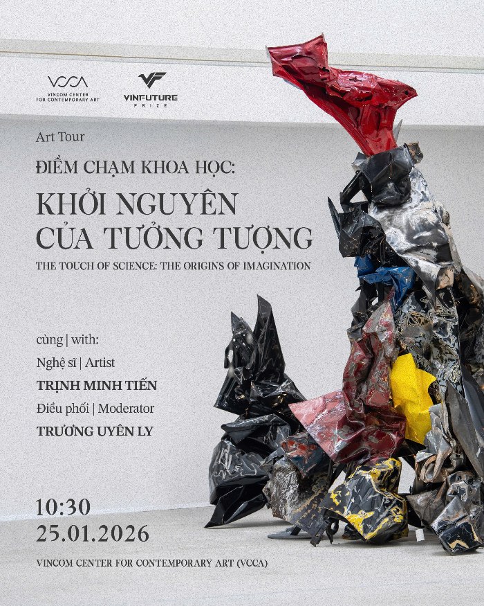 Xuất phát bằng câu hỏi “trí tưởng tượng bắt đầu từ đâu?”, art tour là hành trình phản tư, truy vấn cội nguồn của mọi sáng tạo thông qua các tác phẩm trong triển lãm Tỏa V – Điểm chạm khoa học. Từ triết lý về sự hồi sinh của vật chất tới những khoảng trống trong không gian tâm tưởng, mỗi tác phẩm là một nhịp cầu dẫn dắt người xem đi xuyên qua lớp vỏ hữu hình để chạm vào những “miền tưởng tượng” chưa từng được biết tới.