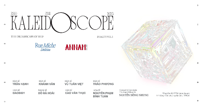 Trong sự kiện đánh dấu không gian mới, Rue Miche và Annam Gallery hân hạnh giới thiệu triển lãm nhóm “Kaleidoscope – The Dreamscape of Self” (Kính vạn hoa – Cảnh giới của Bản ngã). Nếu Vol.1 là tiếng thì thầm của sự tối giản, thì Vol.2 lại bùng nổ như một bản hòa tấu thị giác: những tác phẩm rực rỡ, đa sắc, chuyển động, không ngừng thách thức ánh nhìn của người xem. Từ những bố cục bùng nổ đến các lớp màu biến ảo, mỗi tác phẩm là một thử nghiệm về cường độ màu sắc – như từng mảnh gương trong kính vạn hoa, phản chiếu và khuếch đại một thế giới nội tâm đa chiều.