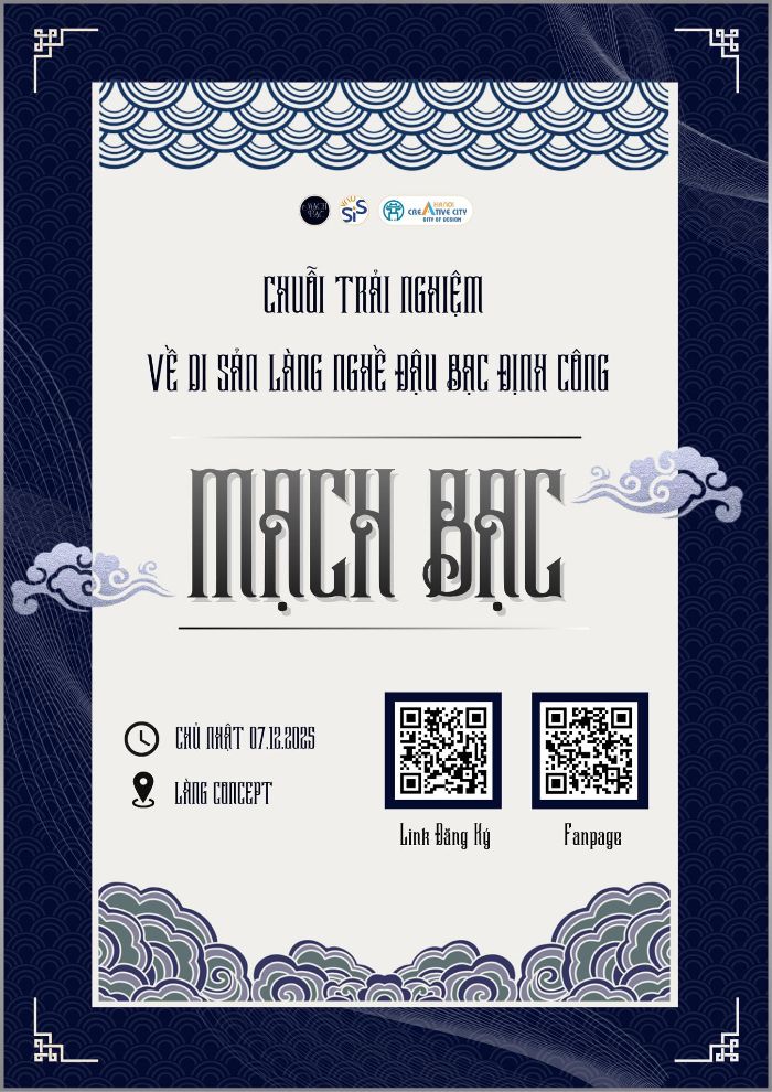 “Mạch Bạc” là chương trình trải nghiệm di sản về một trong tứ trụ tinh hoa của làng nghề Thăng Long xưa: Làng nghề Đậu Bạc Định Công. Đến với “Mạch Bạc” bạn sẽ được trở về với cội nguồn của làng nghề Đậu Bạc Định Công với 4 không gian trải nghiệm Sinh Trưởng Thành Vinh lấy cảm hứng từ dòng chảy của đời người và của nghề, từ khi khai sinh, lớn lên, trưởng thành cho đến lúc tỏa sáng rực rỡ.