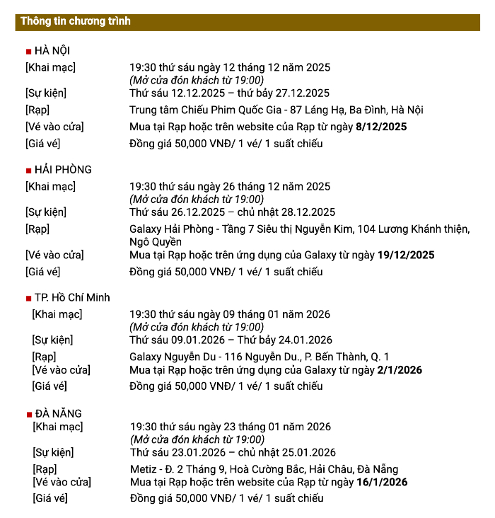 Quỹ Giao lưu Quốc tế Nhật Bản (The Japan Foundation) tại Việt Nam trân trọng giới thiệu Liên hoan Phim Nhật Bản 2025, sẽ diễn ra từ 12/12/2025 đến 25/01/2026 tại bốn thành phố: Hà Nội, Hải Phòng, Thành phố Hồ Chí Minh và Đà Nẵng.
